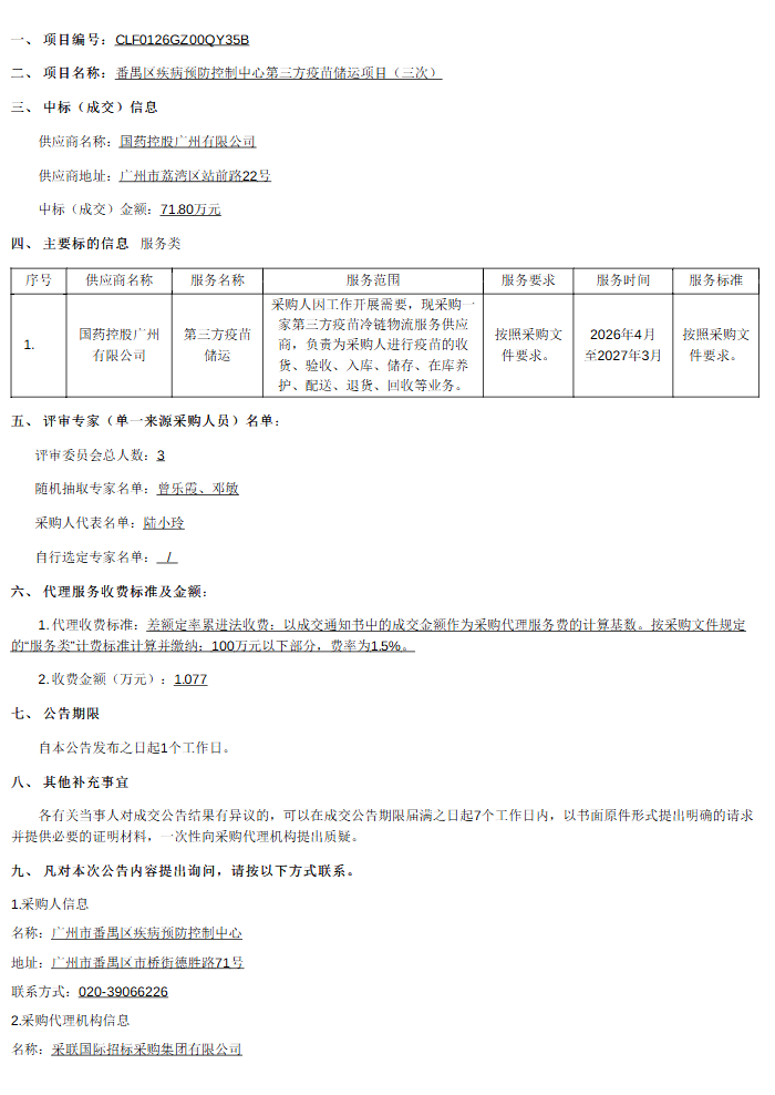【广州市番禺区疾病预防控制中心】广东省广州市番禺区疾病预防控制中心第三方疫苗储运项目(三次) (CLF0126GZ00QY35B)成交结果公告