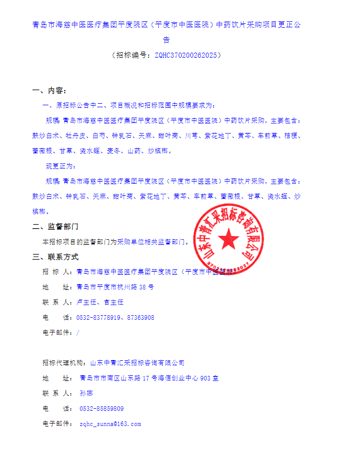 【青岛市海慈医疗集团】山东省青岛市海慈中医医疗集团平度院区(平度市中医医院)中药饮片采购项目更正公告