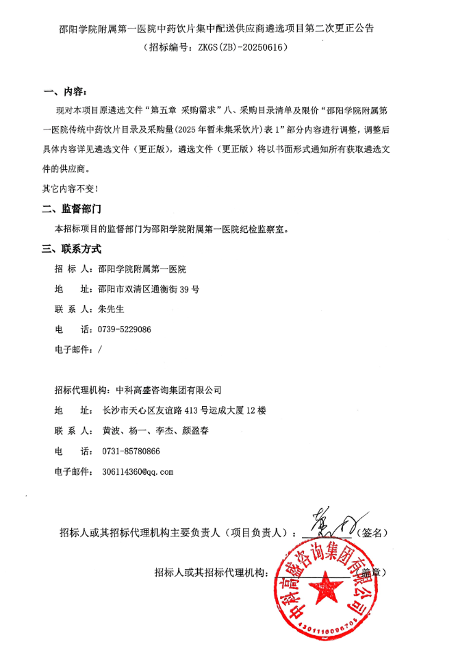 【邵阳学院附属第一医院】湖南省邵阳学院附属第一医院中药饮片集中配送供应商遴选项目第二次更正公告