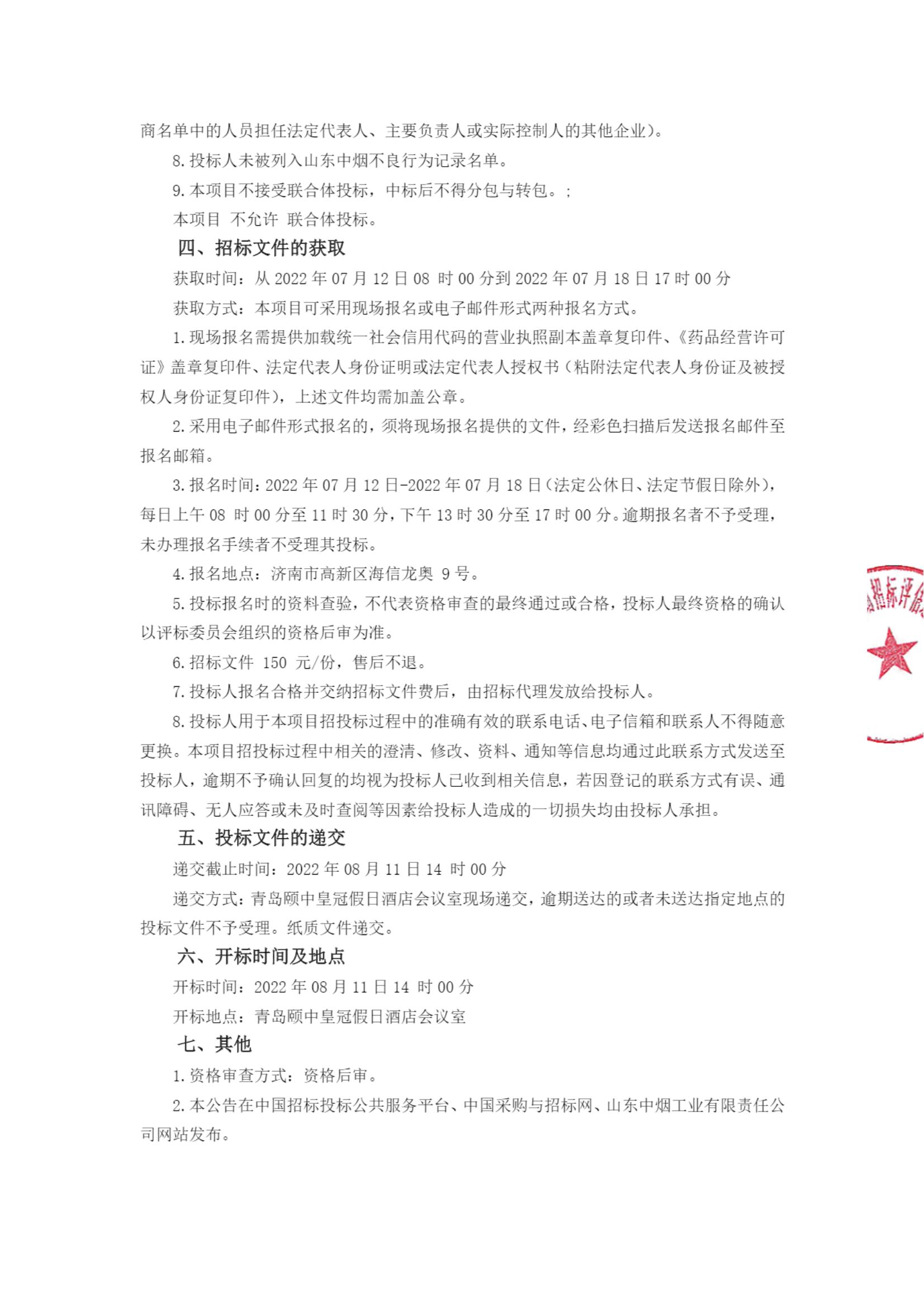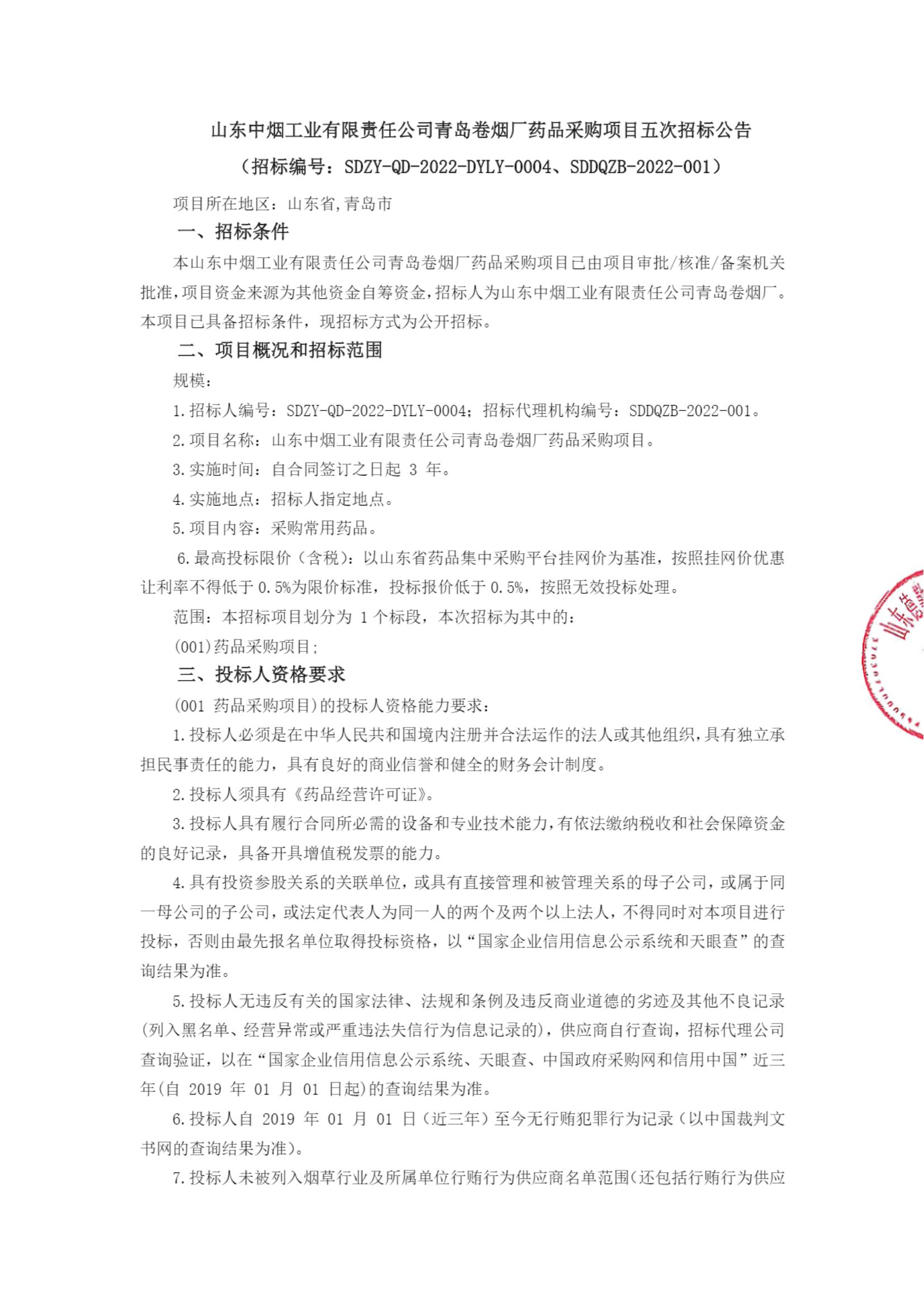 【山东中烟工业有限责任公司】山东中烟工业有限责任公司青岛卷烟厂药品采购项目五次招标公告