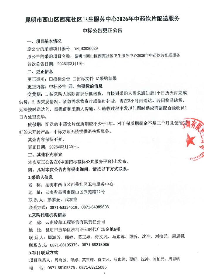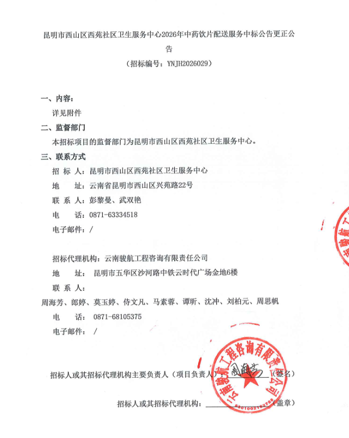 【昆明市西山区西苑社区卫生服务中心】云南省昆明市西山区西苑社区卫生服务中心2026年中药饮片配送服务中标公告更正公告