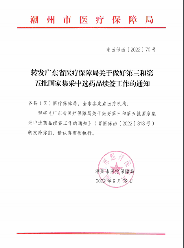 【潮州】潮州市转发广东省医疗保障局关于做好第三和第五批国家集采中选药品续签工作的通知