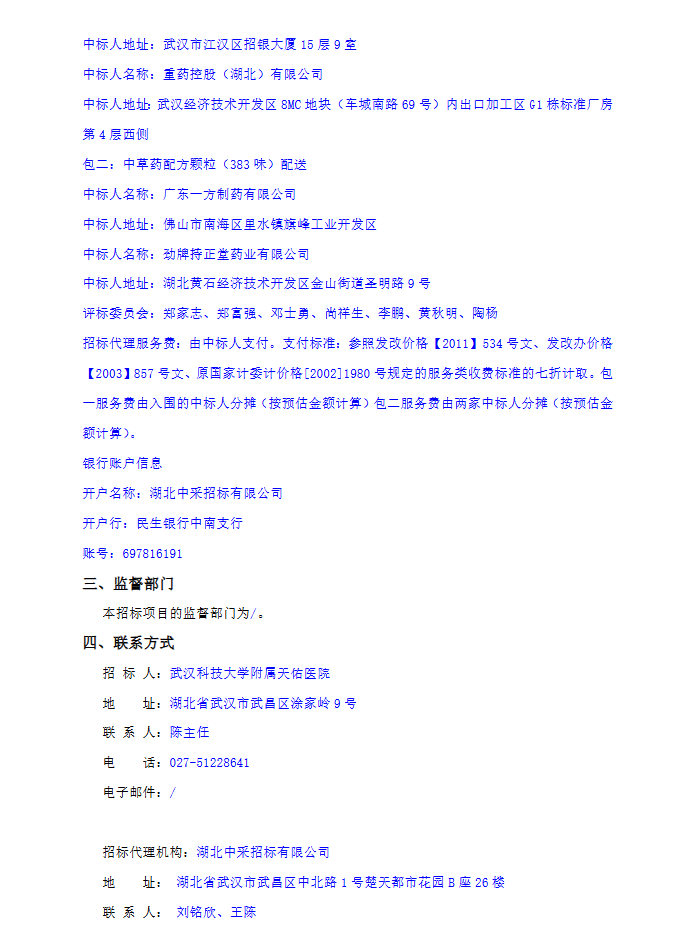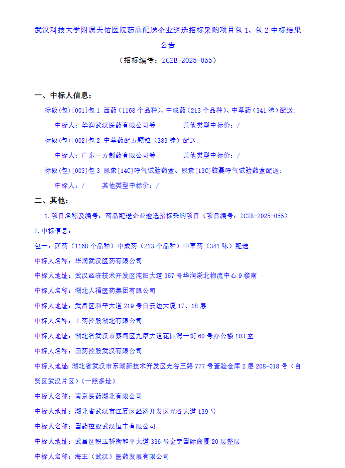 【武汉科技大学附属天佑医院】湖北省武汉科技大学附属天佑医院药品配送企业遴选招标采购项目包1、包2中标结果公告