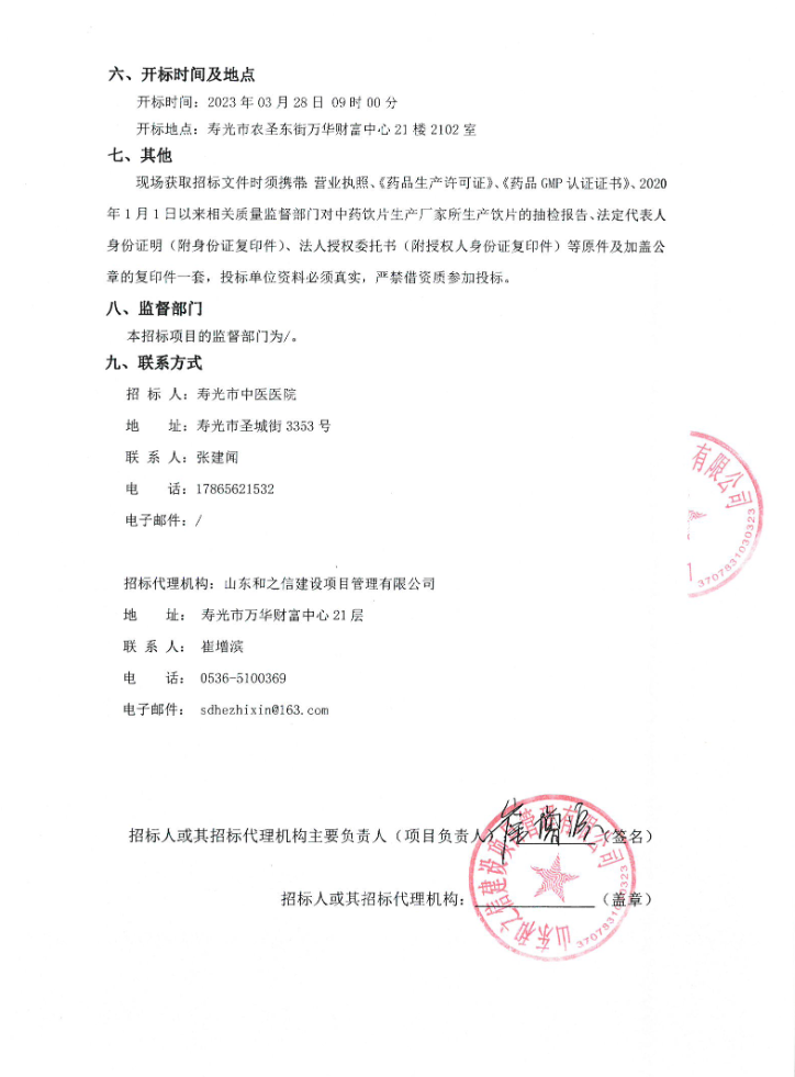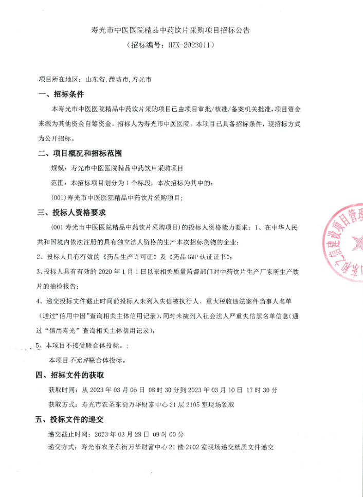 【寿光市中医医院】山东省潍坊市寿光市中医医院精品中药饮片采购项目招标公告