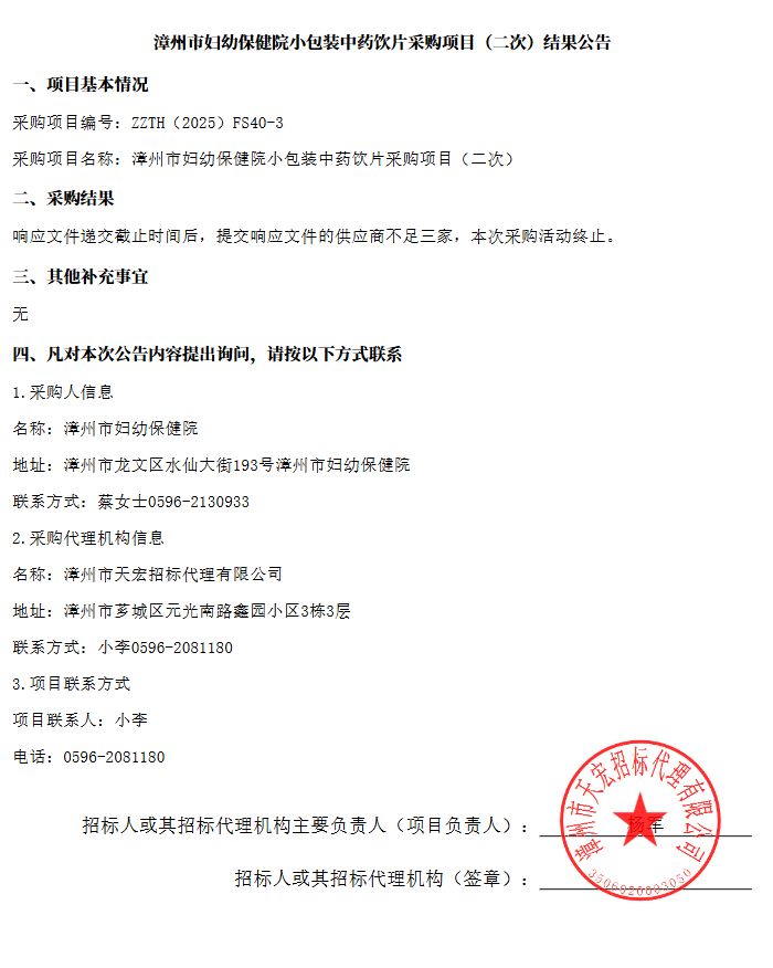 【漳州市妇幼保健院】福建省漳州市妇幼保健院小包装中药饮片采购项目(二次)结果公告