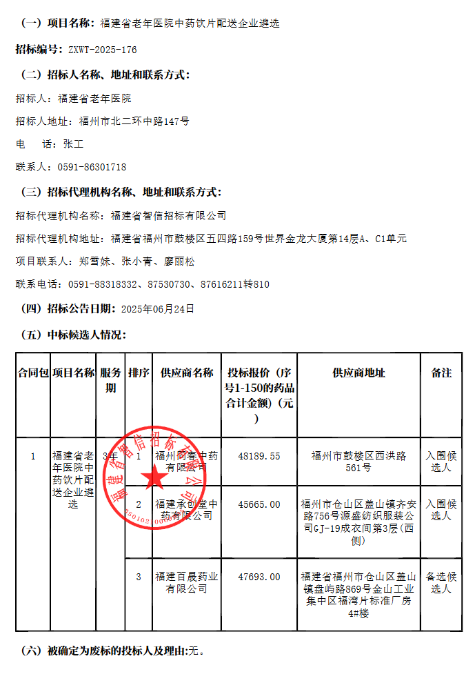 【福建省老年医院】福建省老年医院中药饮片配送企业遴选中标候选人公示