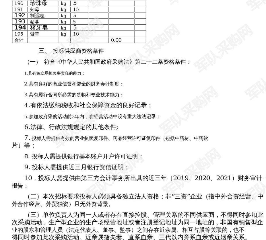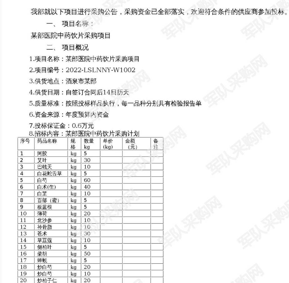 【军队采购网某部】中药饮片采购项目采购公告(2022-LSLNNY-W1002)