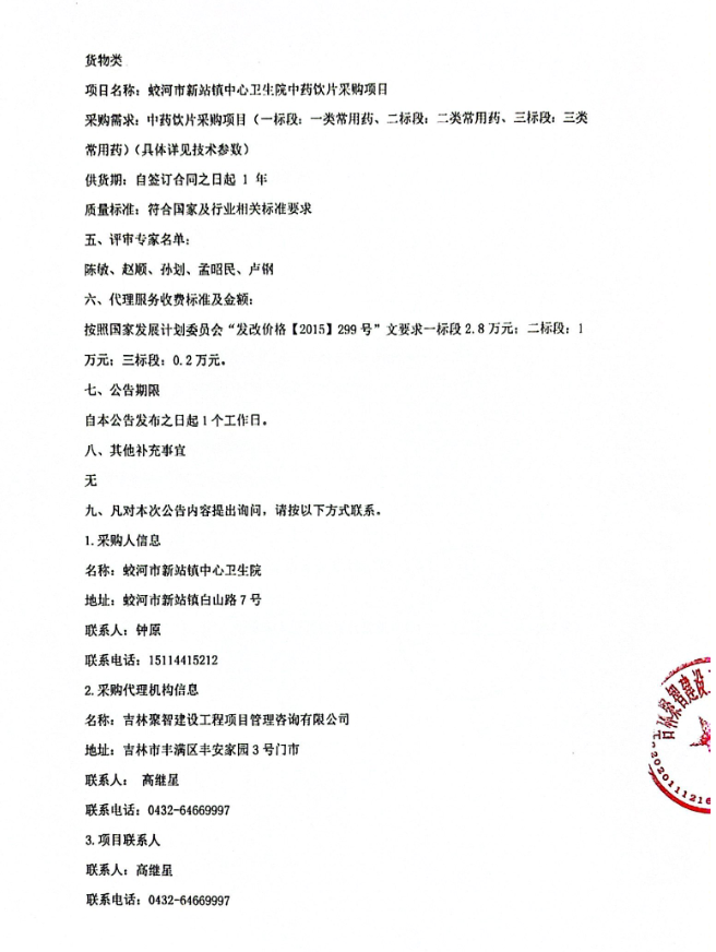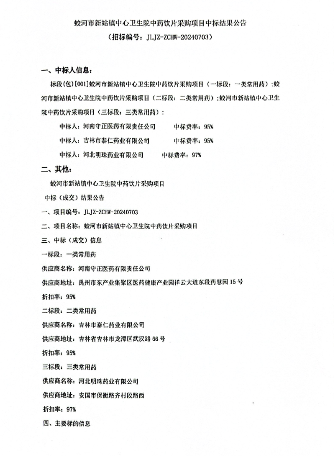 【吉林市蛟河市新站镇中心卫生院】吉林省吉林市蛟河市新站镇中心卫生院中药饮片采购项目中标结果公告