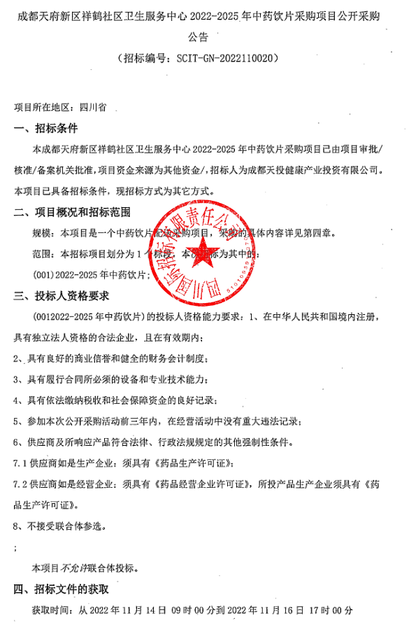 【成都天府新区祥鹤社区卫生服务中心】四川省成都天府新区祥鹤社区卫生服务中心2022-2025年中药饮片采购项目公开采购公告