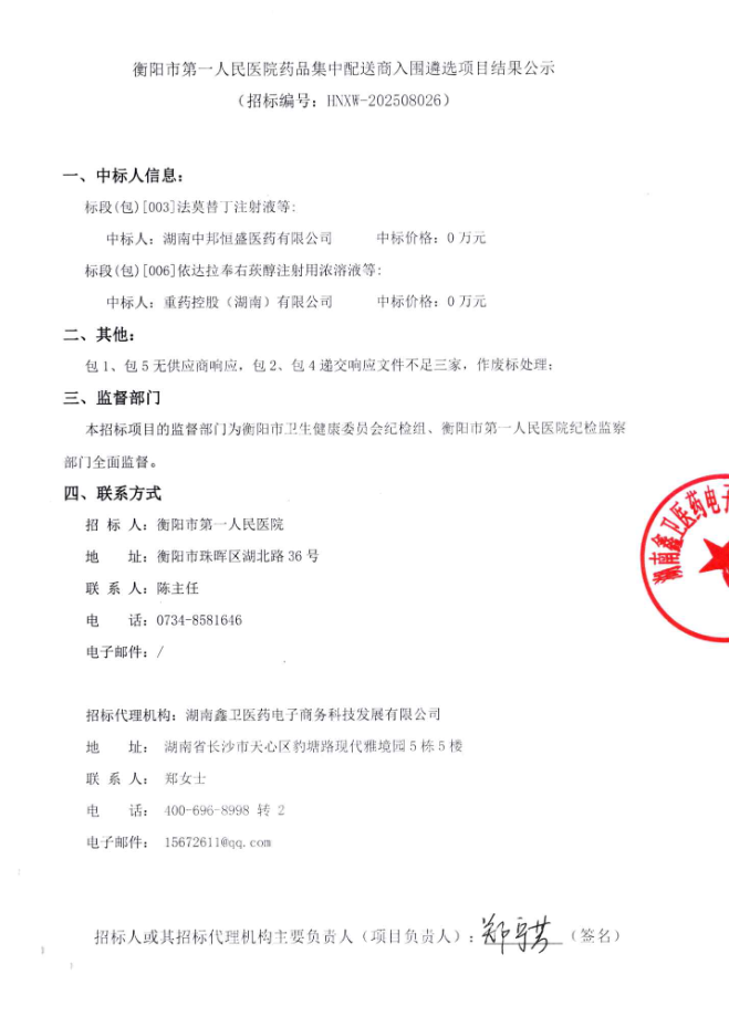 【衡阳市第一人民医院】湖南省衡阳市第一人民医院药品集中配送商入围遴选项目结果公示