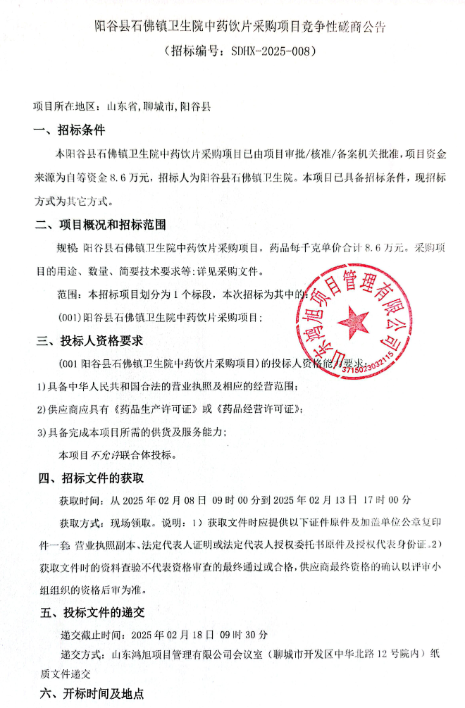 【聊城市阳谷县石佛镇卫生院】山东省聊城市阳谷县石佛镇卫生院中药饮片采购项目竞争性磋商公告