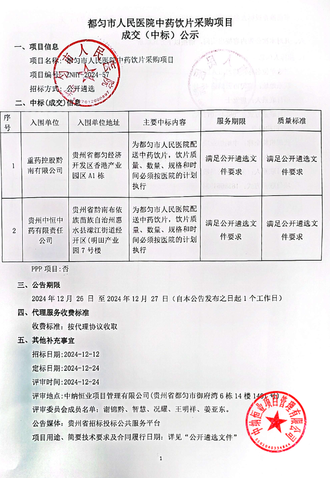 【黔南布依族苗族自治州都匀市人民医院】贵州省黔南布依族苗族自治州都匀市人民医院中药饮片采购项目成交(中标)公示