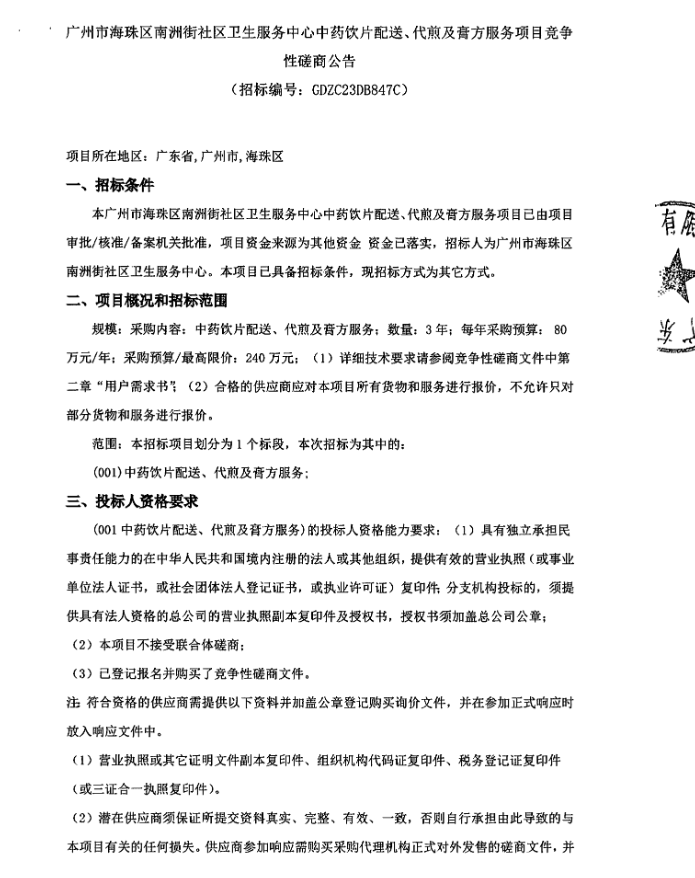 【广州市海珠区南洲街社区卫生服务中心】广东省广州市海珠区南洲街社区卫生服务中心中药饮片配送、代煎及膏方服务项目竞争性磋商公告