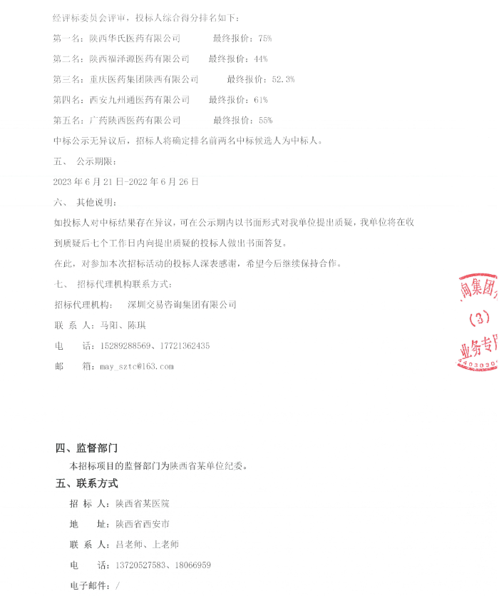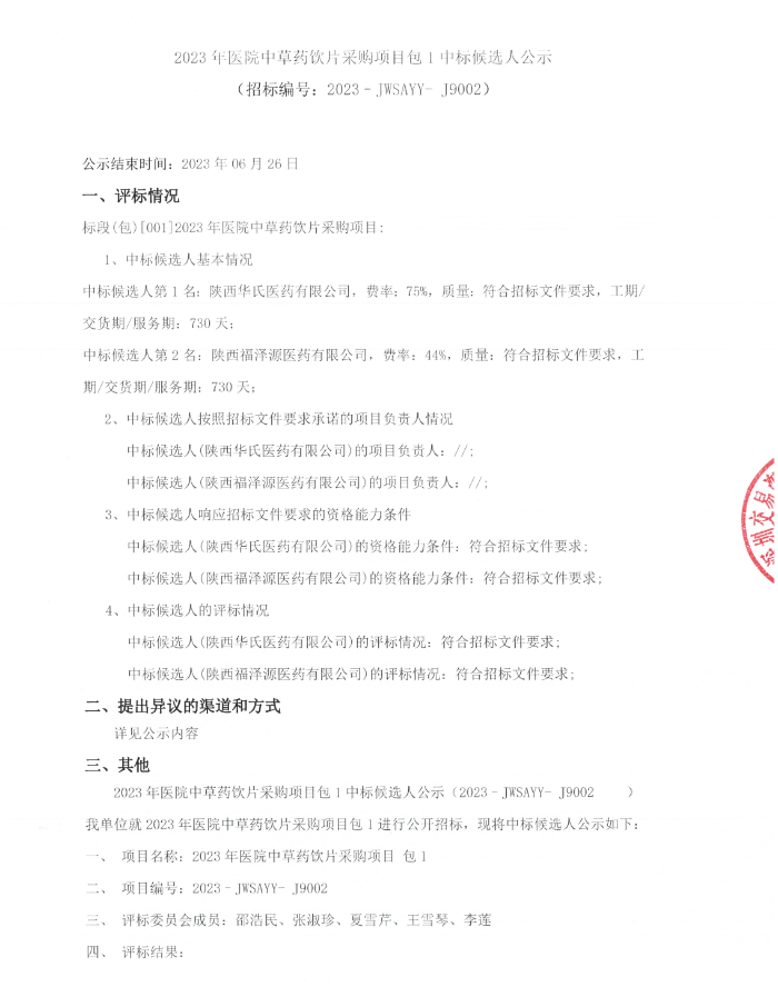 【西安市某医院】陕西省西安市某医院2023年医院中草药饮片采购项目包1中标候选人公示