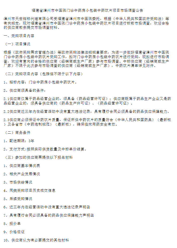 【漳州市中医院】福建省漳州市中医院门诊中药房小包装中药饮片项目市场调查公告招标公告