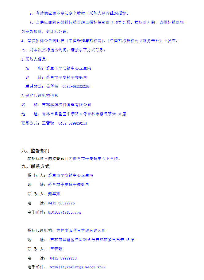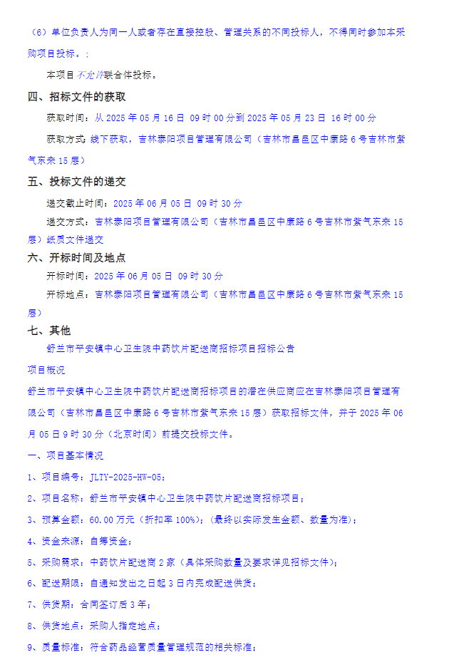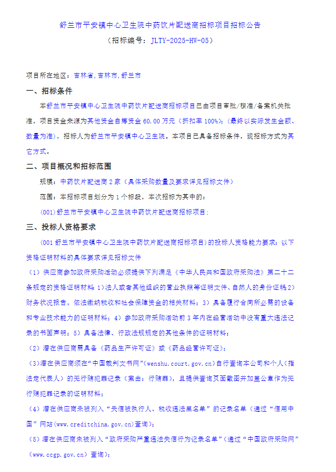 【吉林市舒兰市平安镇中心卫生院】吉林省吉林市舒兰市平安镇中心卫生院中药饮片配送商招标项目招标公告