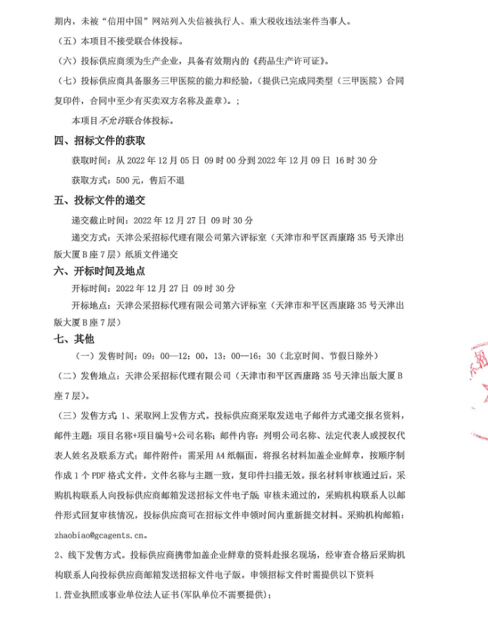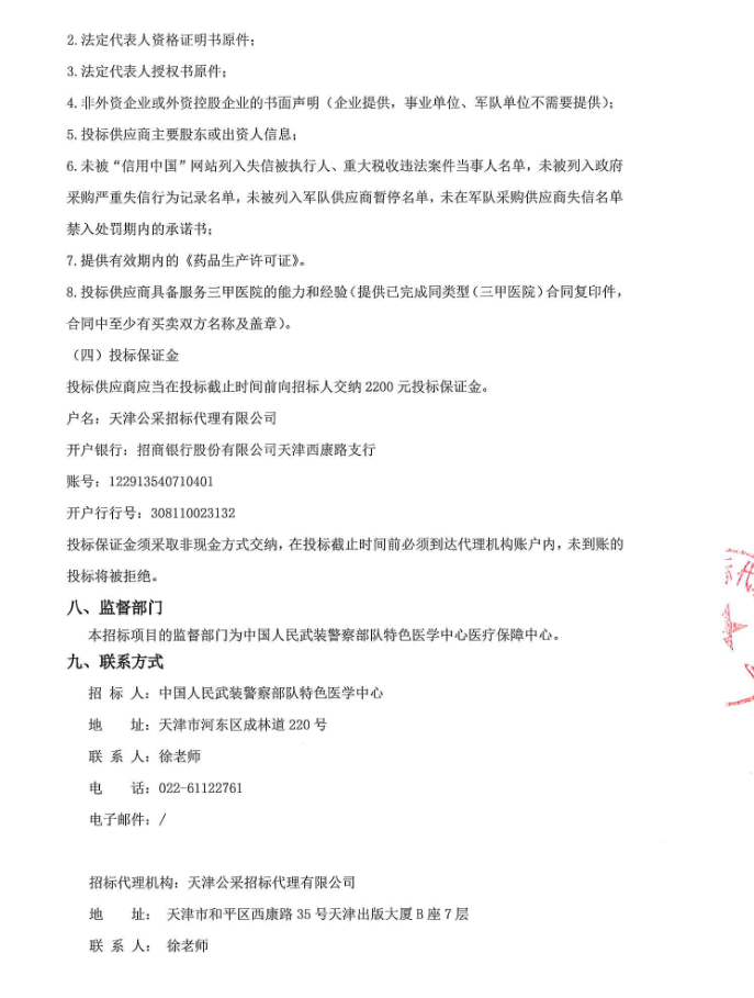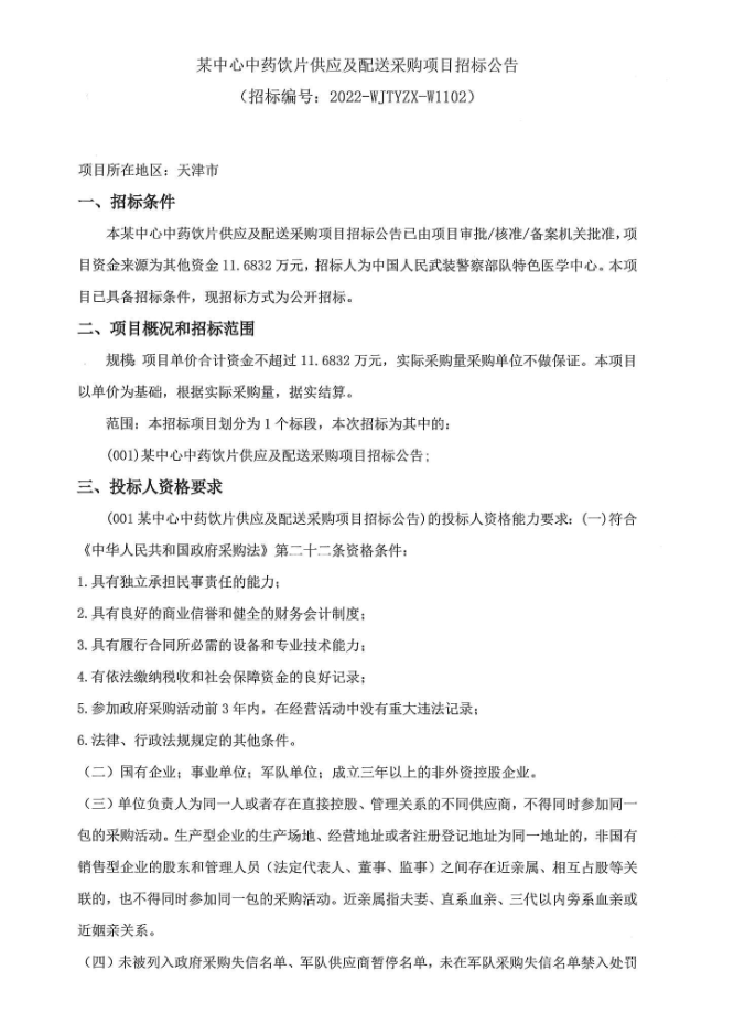 【中国人民武装警察部队特色医学中心】天津河东区某中心中药饮片供应及配送采购项目招标公告