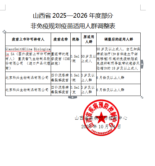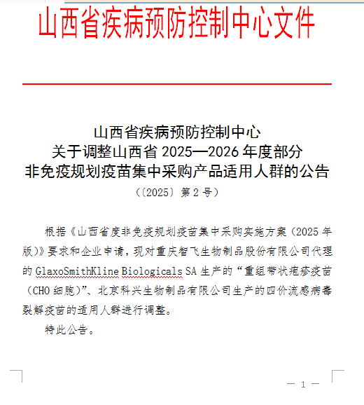 【山西】山西省疾病预防控制中心关于调整山西省2025-2026年度部分非免疫规划疫苗集中采购产品适用人群的公告