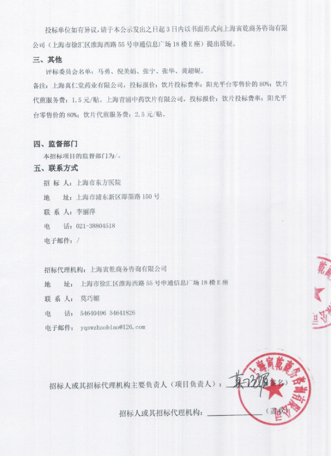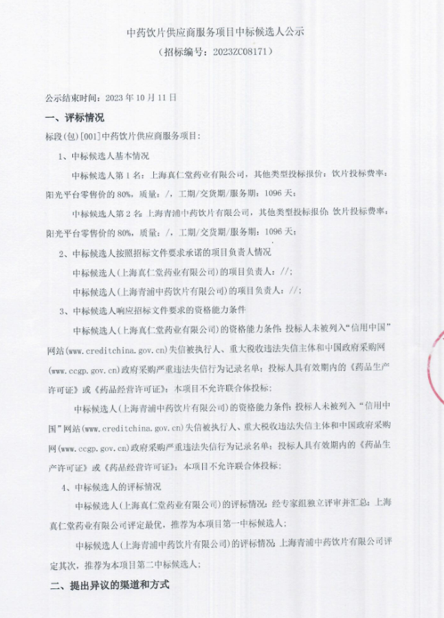 【上海市东方医院】上海市东方医院中药饮片供应商服务项目中标候选人公示