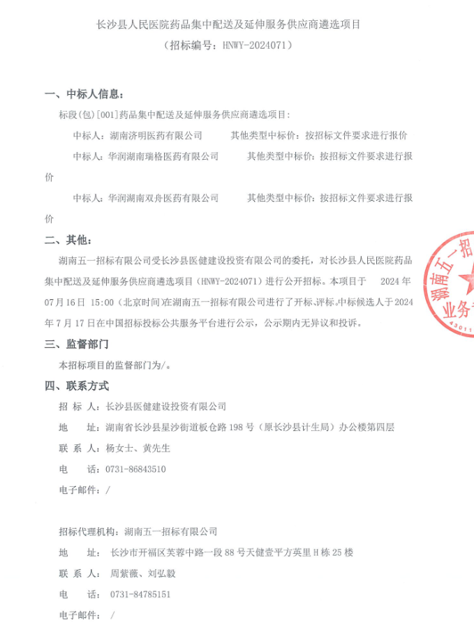 【长沙市长沙县人民医院】湖南省长沙市长沙县人民医院药品集中配送及延伸服务供应商遴选项目