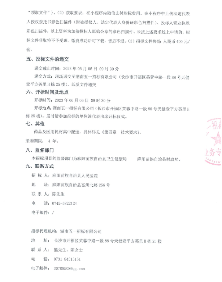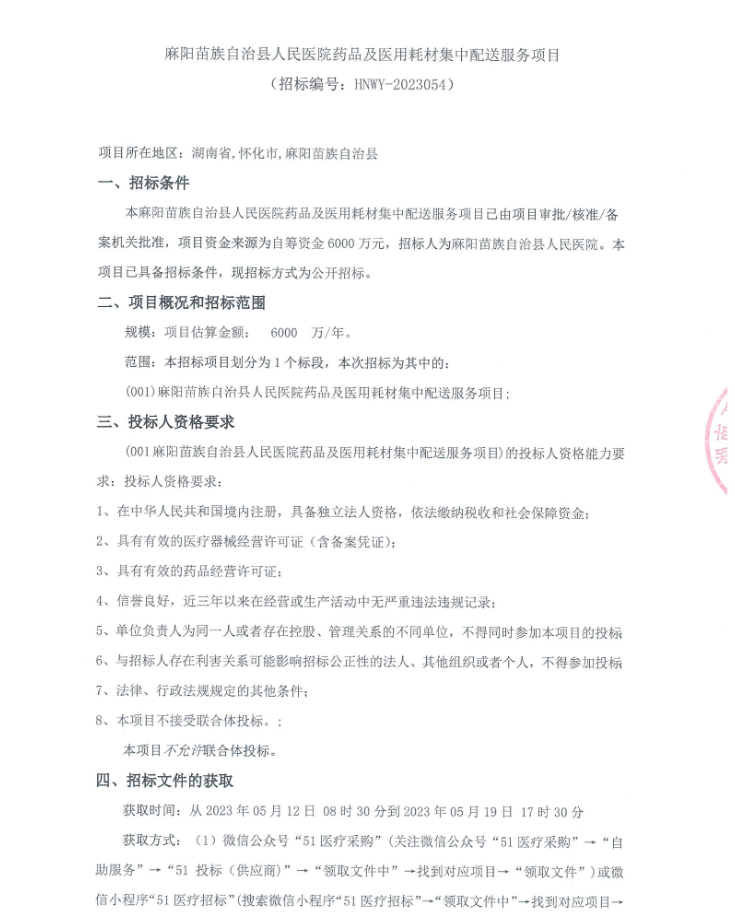 【怀化市麻阳苗族自治县人民医院】湖南省怀化市麻阳苗族自治县人民医院药品及医用耗材集中配送服务项目
