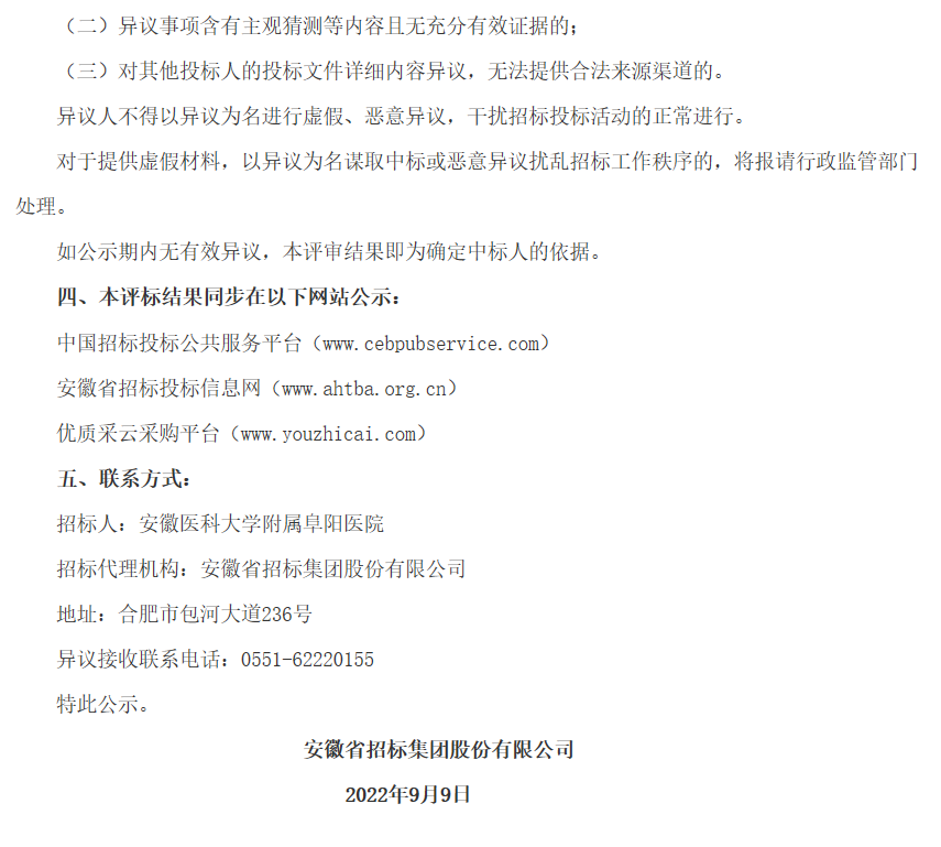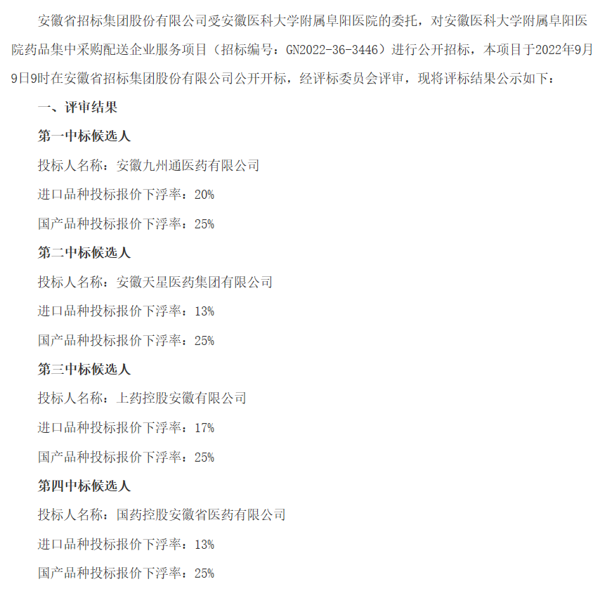 【安徽医科大学附属阜阳医院】药品集中采购配送企业服务项目中标候选人公示