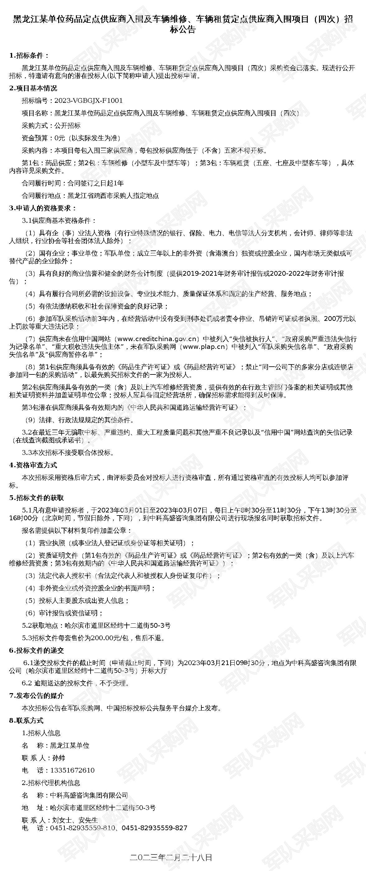 【军队采购】军队采购网黑龙江某单位药品定点供应商入围及车辆维修、车辆租赁定点供应商入围项目(四次)招标公告2023-VGBGJX-F1001