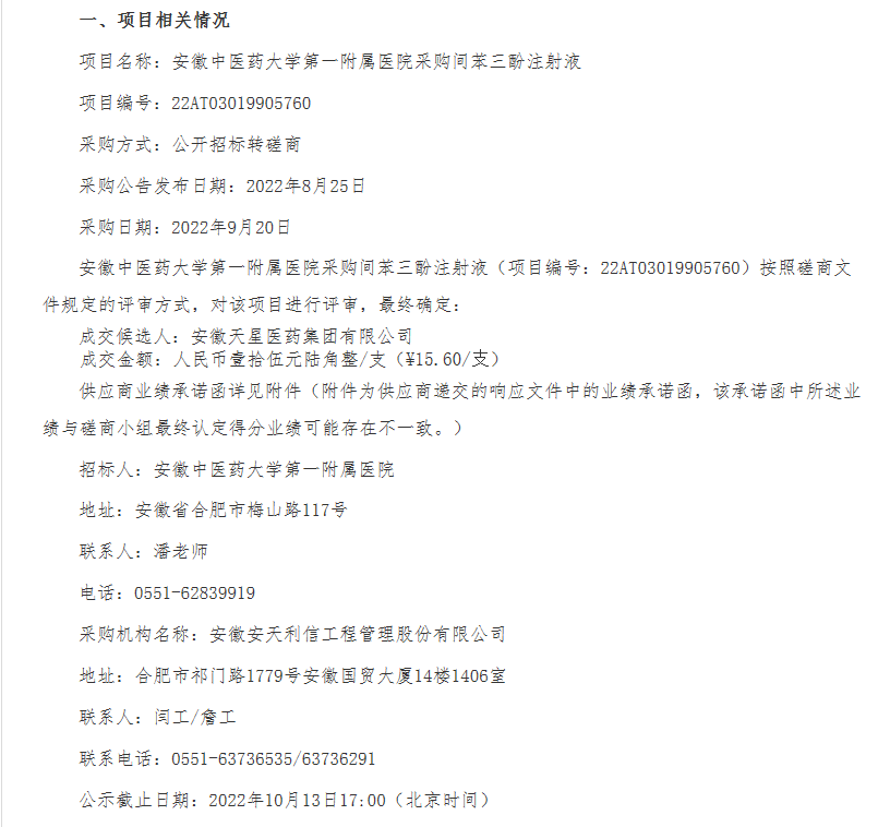 【安徽中医药大学第一附属医院】采购间苯三酚注射液成交公示