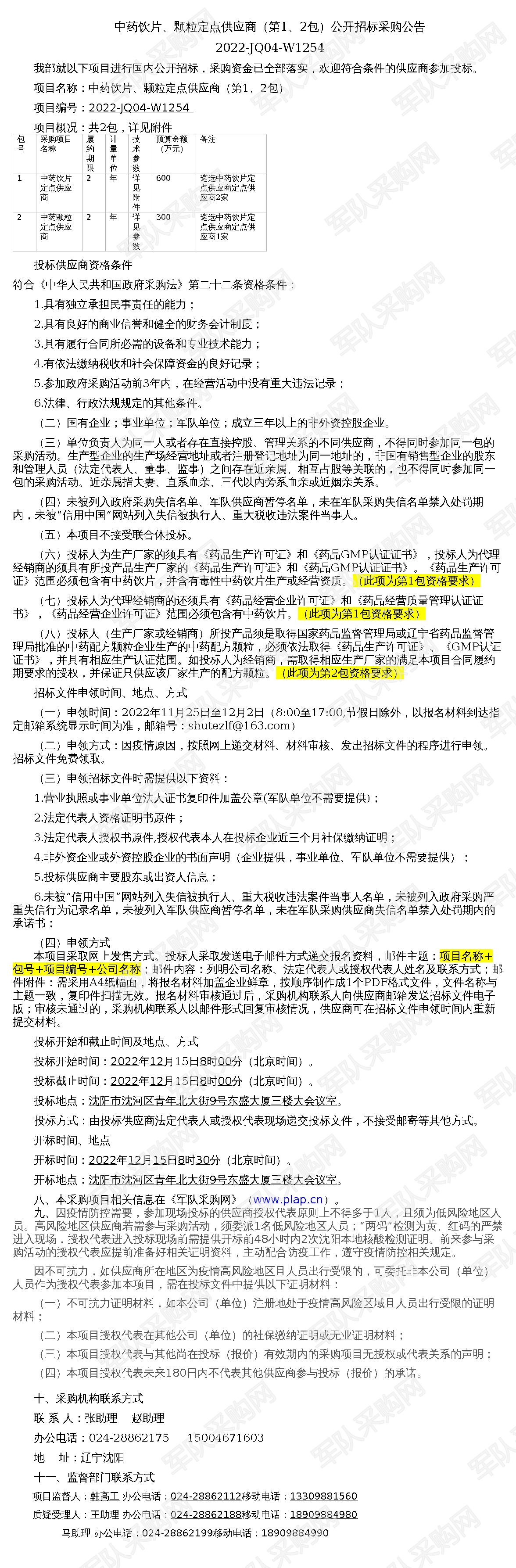 【军队采购】军队采购网中药饮片、颗粒定点供应商(第1、2包)公开招标采购公告2022-JQ04-W1254