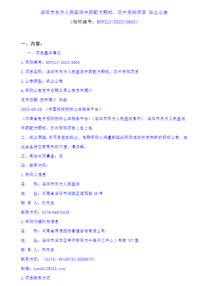 【洛阳市东方人民医院】河南省洛阳市东方人民医院中药配方颗粒、饮片采购项目终止公告