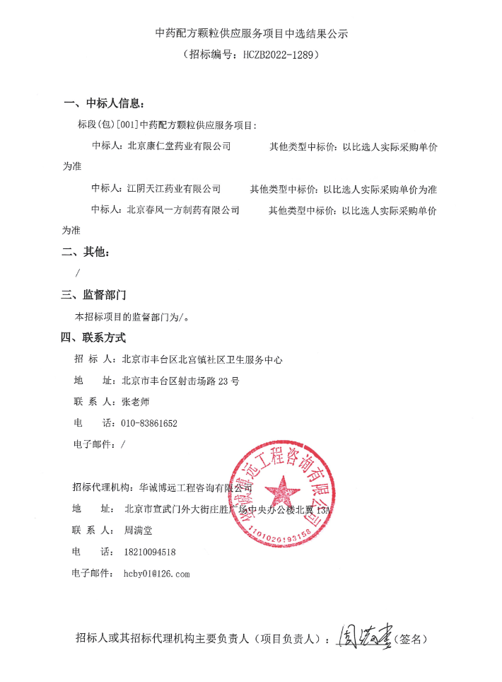 【北京市丰台区北宫镇社区卫生服务中心】北京市丰台区北宫镇社区卫生服务中心中药配方颗粒供应服务项目中选结果公示