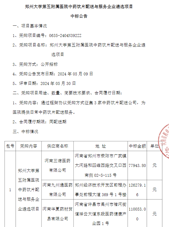【郑州大学第五附属医院】河南省郑州大学第五附属医院中药饮片配送与服务企业遴选项目-中标公告