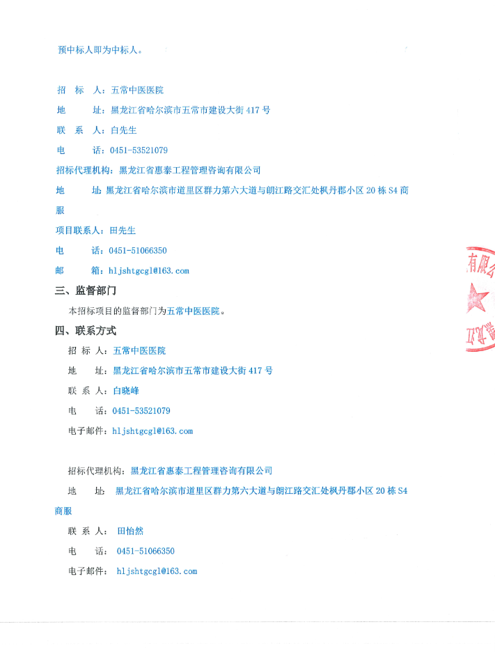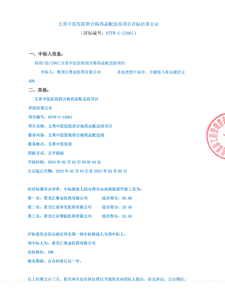 【哈尔滨市五常中医医院】黑龙江省哈尔滨市五常中医医院招合格药品配送商项目评标结果公示
