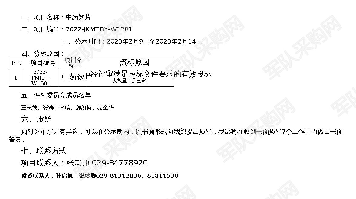 【军队采购】军队采购网中药饮片项目流标公示(2022-JKMTDY-W1381)