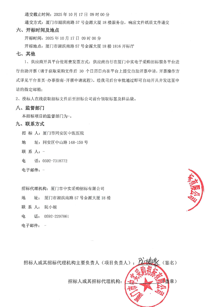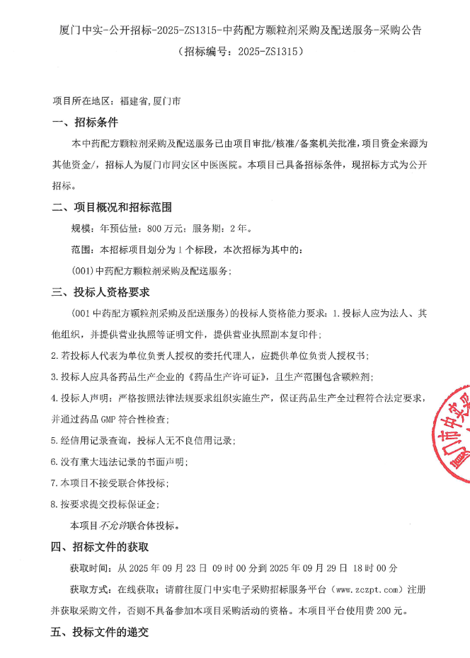 【厦门市同安区中医医院】福建省厦门中实-公开招标-2025-ZS1315-中药配方颗粒剂采购及配送服务-采购公告