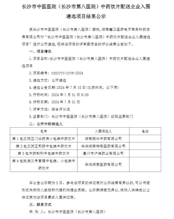 【长沙市中医医院】湖南省长沙市中医医院(长沙市第八医院)中药饮片配送企业入围遴选项目结果公示