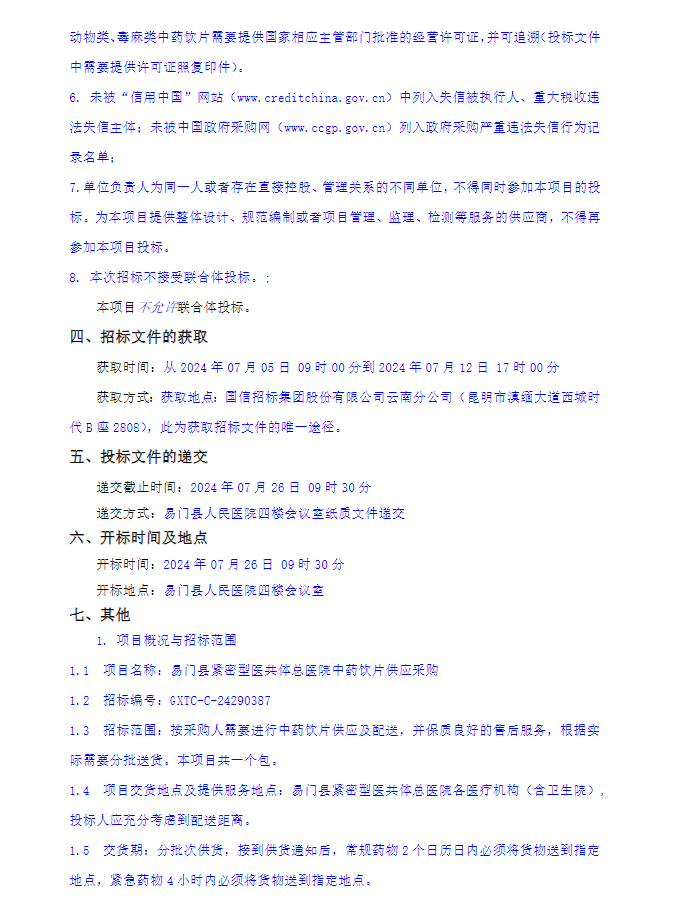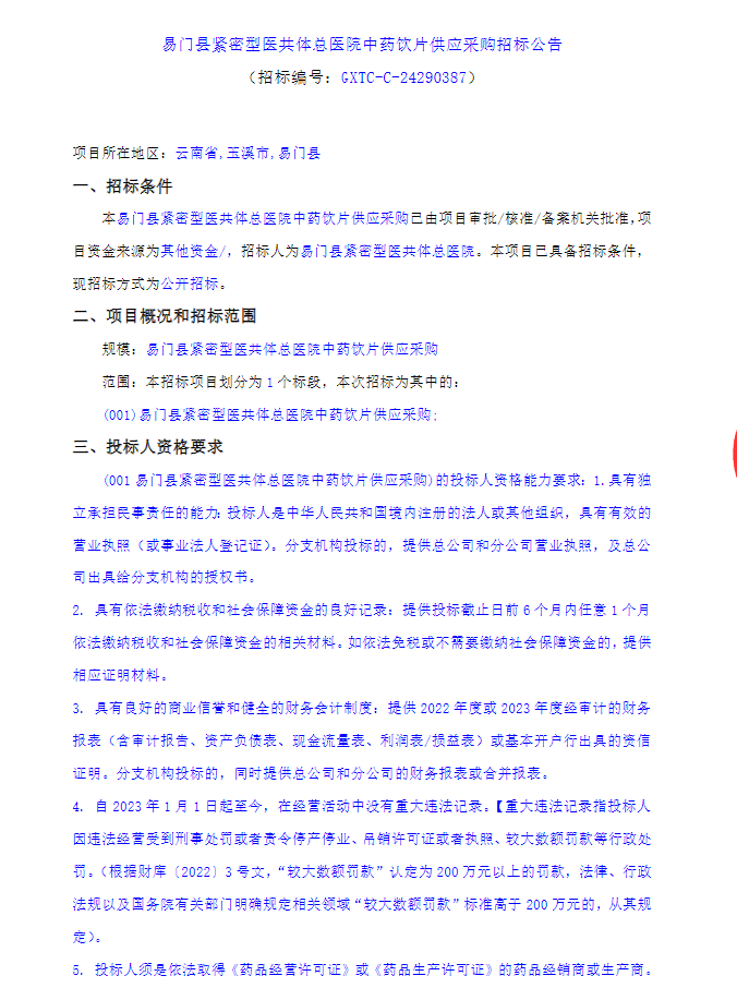 【玉溪市易门县紧密型医共体总医院】云南省玉溪市易门县紧密型医共体总医院中药饮片供应采购招标公告