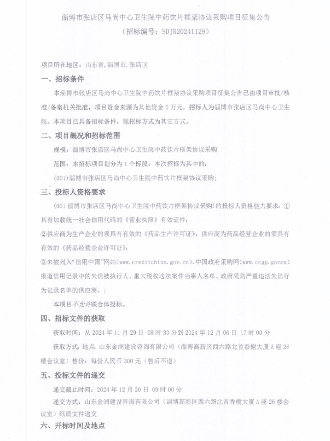 【淄博市张店区马尚中心卫生院】山东省淄博市张店区马尚中心卫生院中药饮片框架协议采购项目征集公告