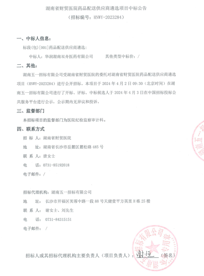 【湖南省财贸医院】湖南省财贸医院药品配送供应商遴选项目中标公告