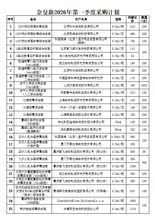 为进一步规范全旗非免疫规划疫苗采购管理,保障非免疫规划疫苗供应,防范非免疫规划疫苗在采购、使用过程中发生违法、违规行为,为人民群众提供安全有效、价格合理的非免疫规划疫苗,保障人民群众身体健康,根据《中华人民共和国疫苗管理法》《内蒙古自治区非免疫规划疫苗采购实施方案》《关于进一步加强非免疫规划疫苗采购管理工作的通知》等有关规定,按照公开、公平、公正、诚信原则,2026年1月30日奈曼旗非免疫规划疫苗采购管理组召开了2026年奈曼旗非免疫规划疫苗采购第一次会议,会议集体讨论通过了采购事宜,现将采购计划情况公示如下: