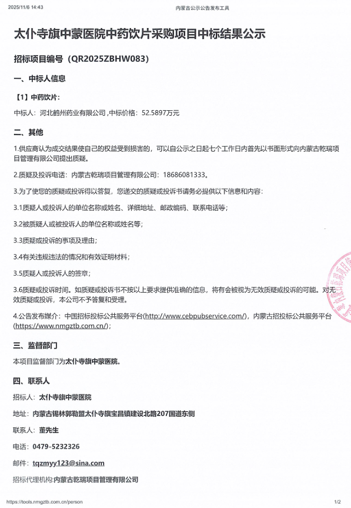 【锡林郭勒盟太仆寺旗中蒙医院】内蒙古自治区锡林郭勒盟太仆寺旗中蒙医院中药饮片采购项目中标结果公示