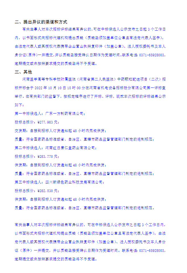 【河南医学高等专科学校附属医院(河南省第二人民医院)】中药颗粒配送项目(二次)中标候选人公示
