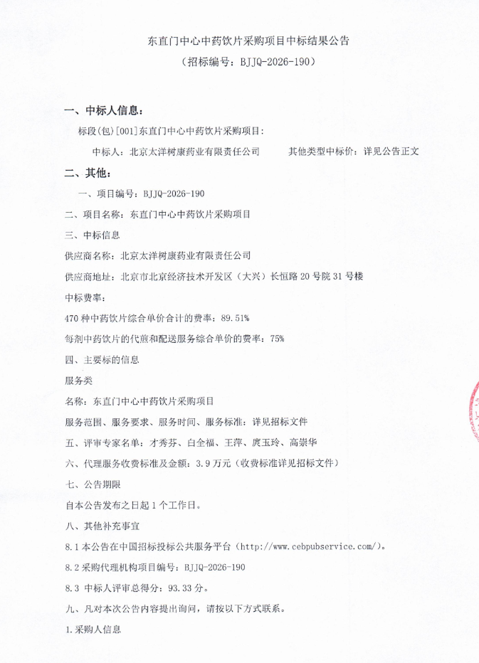 【北京市东城区社区卫生服务管理中心】北京市东直门中心中药饮片采购项目中标结果公告
