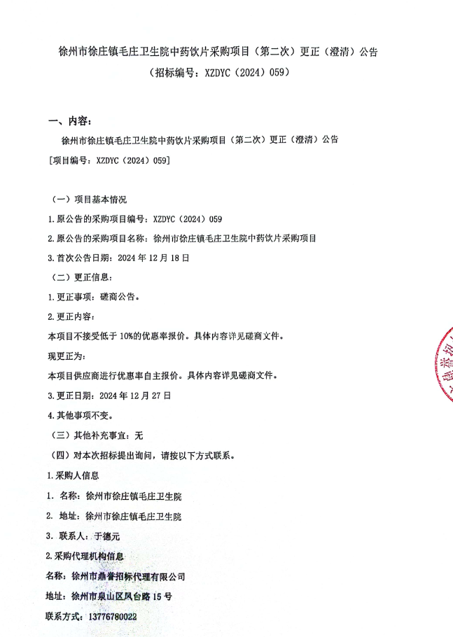 【徐州市徐庄镇毛庄卫生院】江苏省徐州市徐庄镇毛庄卫生院中药饮片采购项目(第二次)更正(澄清)公告