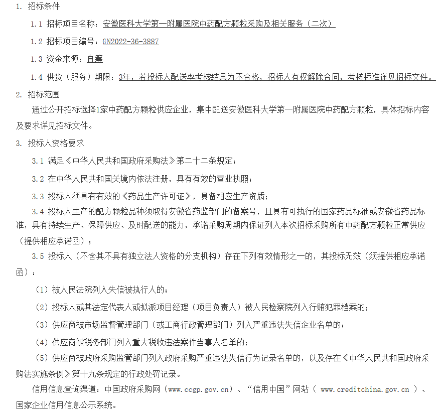 【安徽医科大学第一附属医院】中药配方颗粒采购及相关服务招标公告(20220920)
