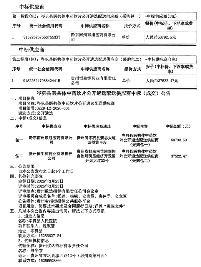 【黔东南苗族侗族自治州岑巩县人民医院】贵州省岑巩县医共体中药饮片公开遴选配送供应商中标(成交)公告