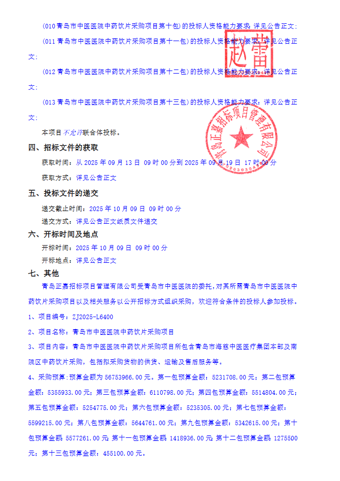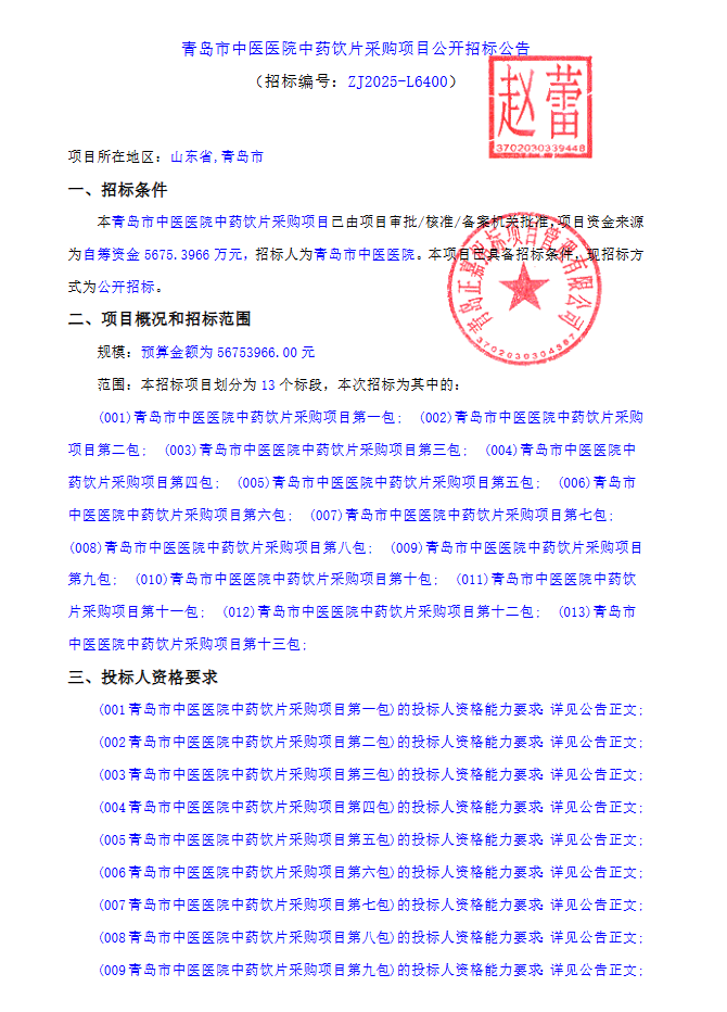 【青岛市中医医院】山东省青岛市中医医院中药饮片采购项目公开招标公告