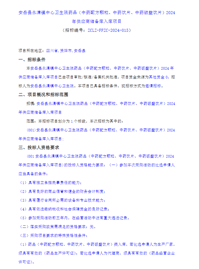 【资阳市安岳县永清镇中心卫生院】四川省资阳市安岳县永清镇中心卫生院药品(中药配方颗粒、中药饮片、中药破壁饮片)2024年供应商储备库入库项目