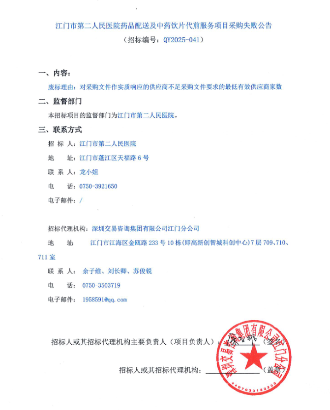 【江门市第二人民医院】广东省江门市第二人民医院药品配送及中药饮片代煎服务项目采购失败公告