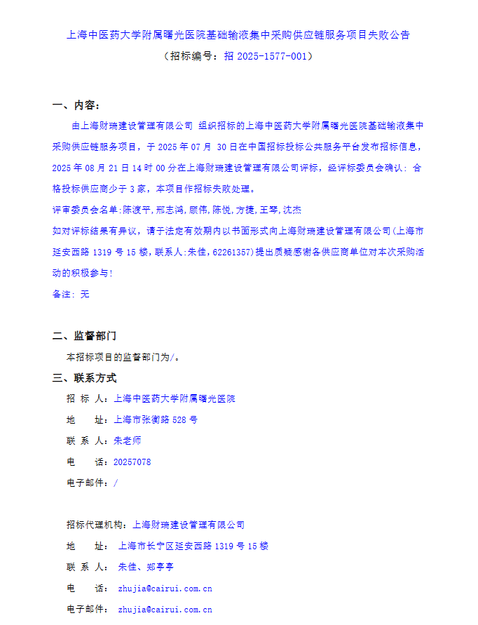 【上海中医药大学附属曙光医院】上海中医药大学附属曙光医院基础输液采购供应链服务项目失败公告